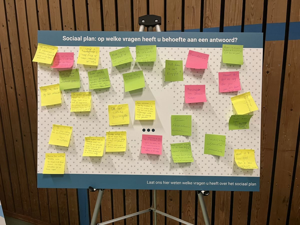 In de gymzaal stonden verschillende informatiepanelen. Daarop werd onder andere de aanleiding van de vernieuwing, de uitkomsten van het woonwensenonderzoek, de uitgangspunten van het sociaal plan, de verschillende scenario’s en de planning van het totale proces en het participatietraject werden toegelicht. Ook was er de mogelijkheid om reacties, wensen of ideeën te delen.