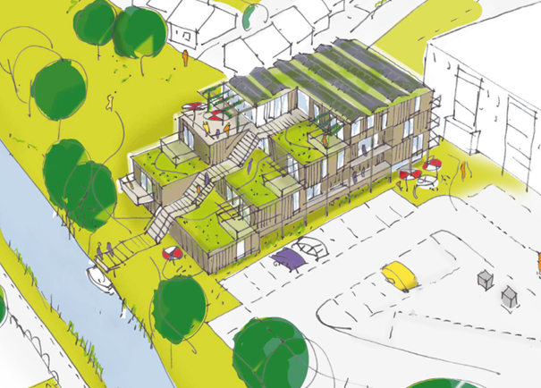 Het schetsontwerp laat zien dat we op de plaats van de huidige 16 appartementen een speels vormgegeven gebouw kunnen ontwikkelen met minimaal 26 appartementen. Ook is er ruimte voor een gemeenschappelijke huiskamer en ontvangsthal. In het ontwerp zoeken we de verbinding met de groene omgeving.